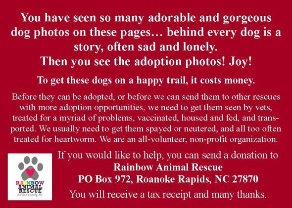 Rainbow Animal Rescue NC P.O. Box 972, Roanoke Rapids, NC 27870 Tax ID # 20-0241166 |